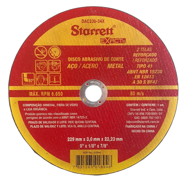 DISCO ABRASIVO DE CORTE STARRETT CATEGORIA EXACT 229X3,0X22,23MM (9″X1/8″X7/8″)