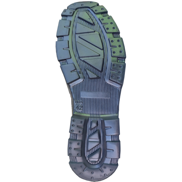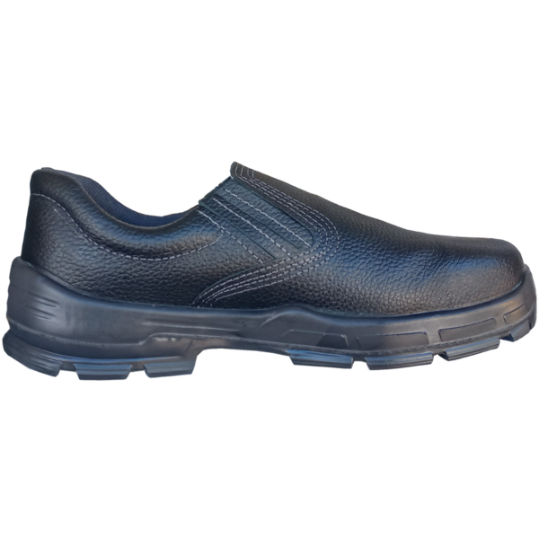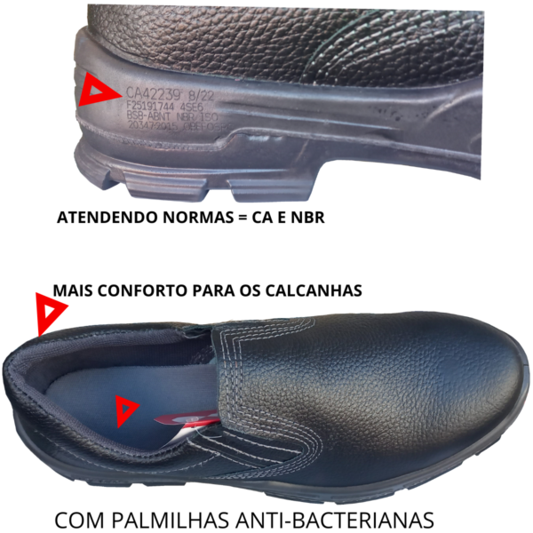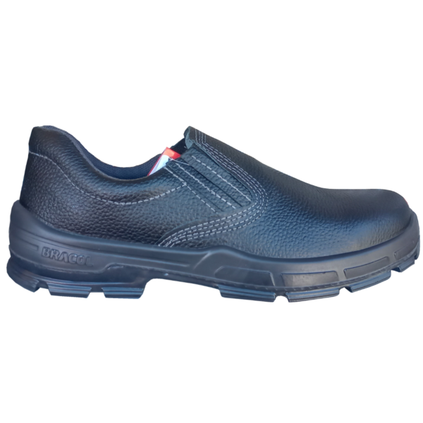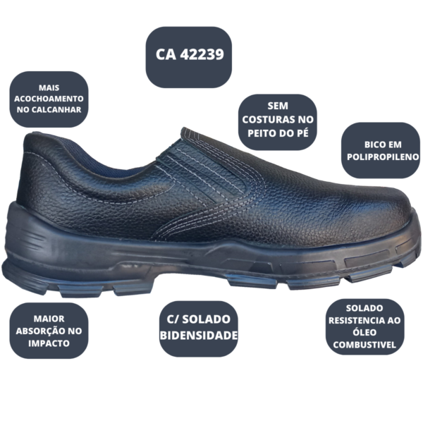 Calçado ocupacional de uso profissional tipo sapato, fechamento em elástico, confeccionado em couro curtido ao cromo, forro da gáspea em não tecido, forro lateral em tecido, palmilha de montagem em material sintético montada pelo sistema strobel, palmilha interna removível, biqueira plástica para conformação, solado de poliuretano bidensidade injetado diretamente no cabedal com resistência ao escorregamento, sistema de absorção de energia na região do salto e resistente ao óleo combustível.